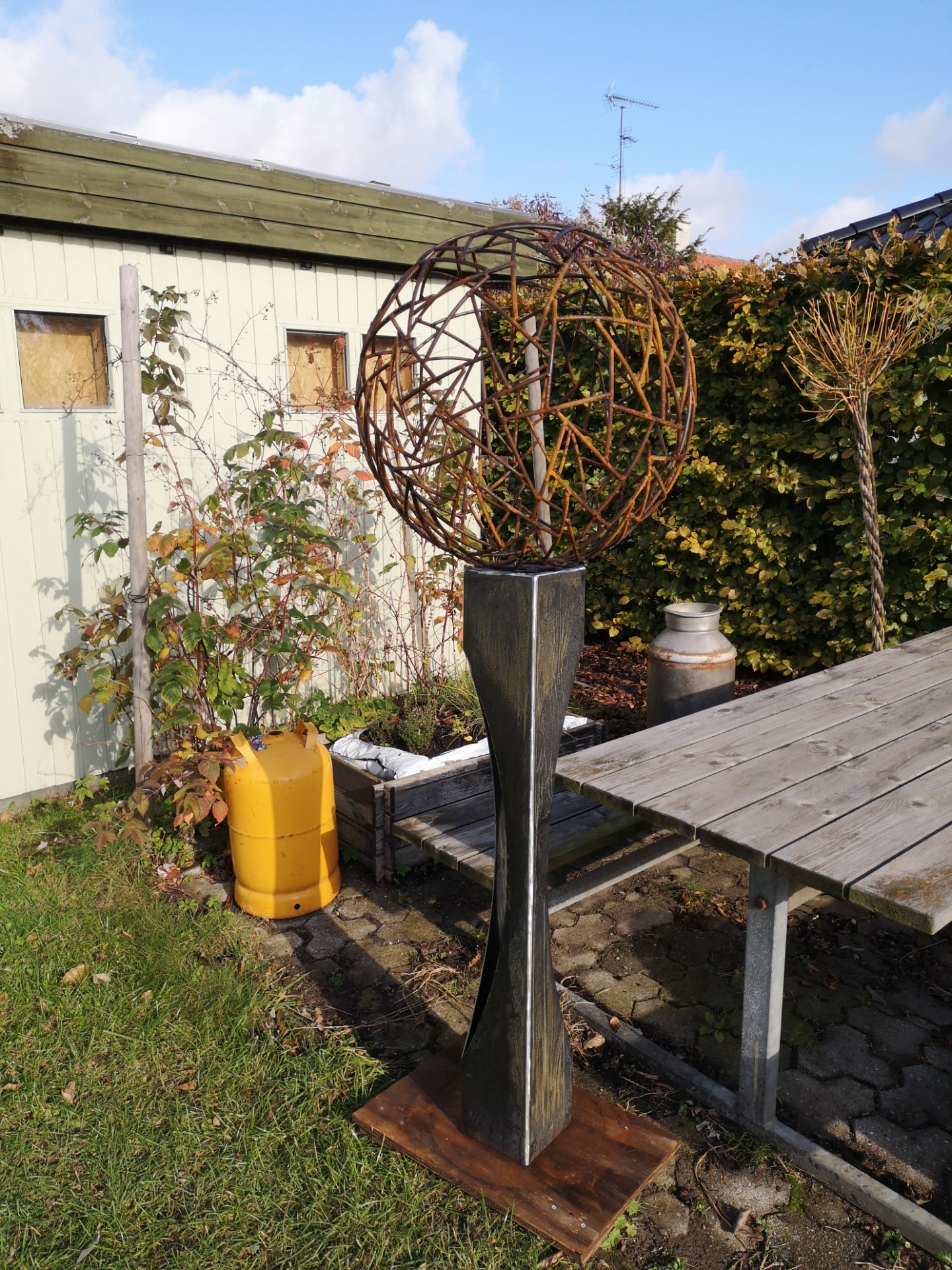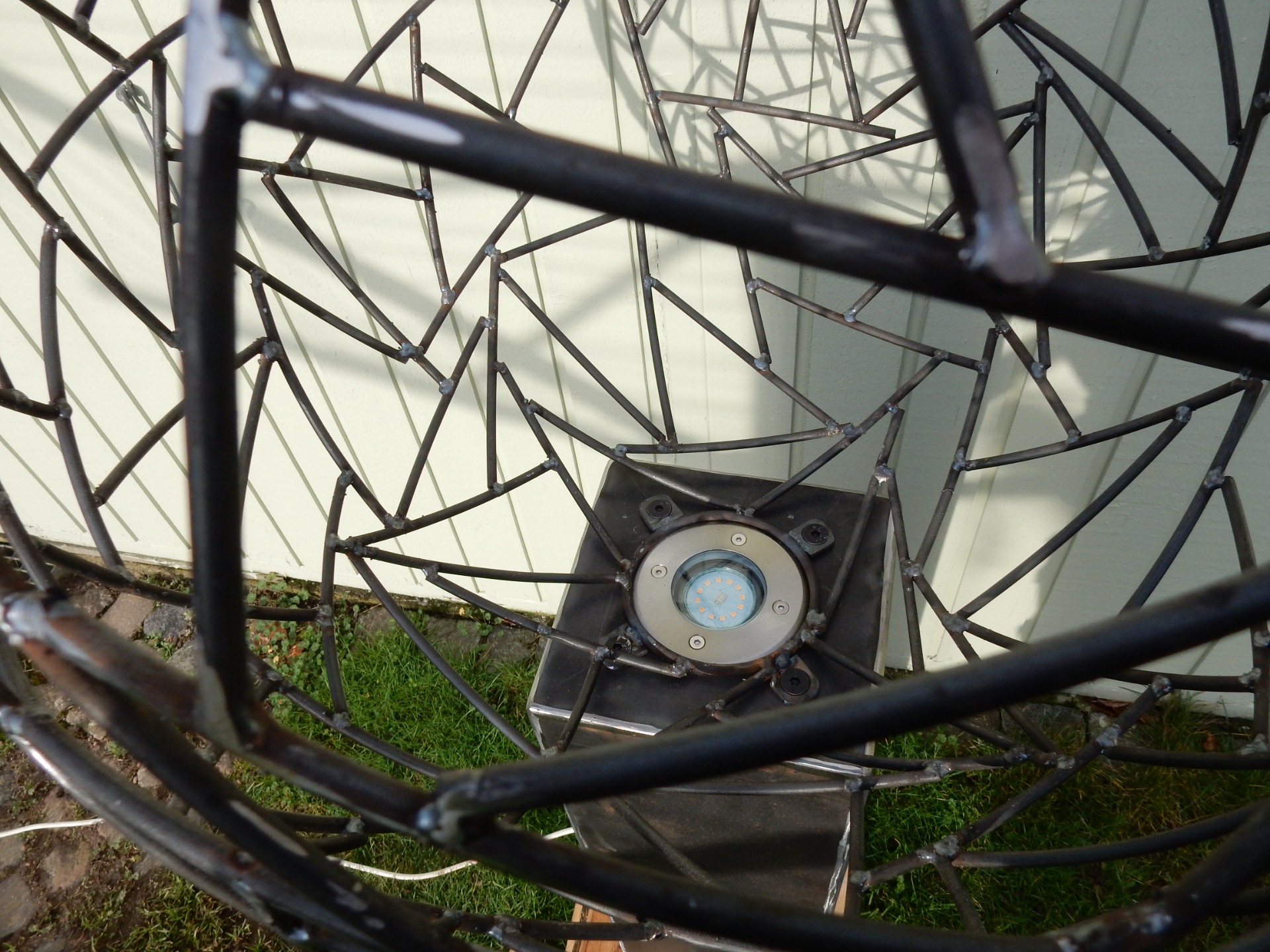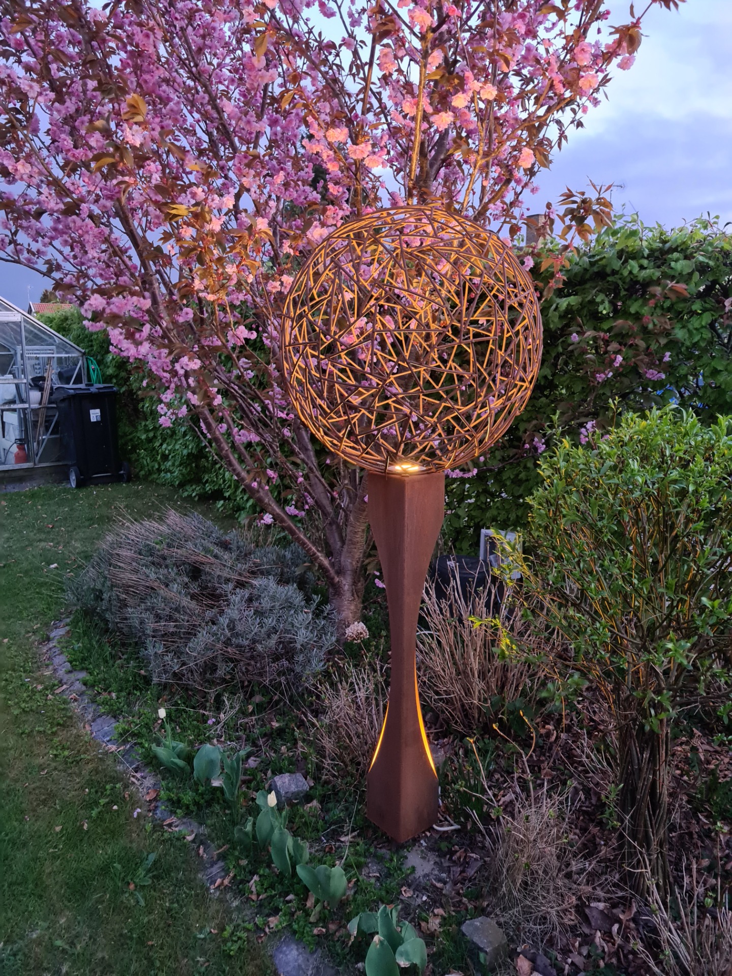 Kaos kuglen (ø70cm) på søjle udført i jern, som har fået en rusten overflade af vejret. Der er indbygget en led spot (IP66) i toppen af søjlen, som giver kuglen liv når det er mørkt. Er lavet til at stille udendørs, monteres i jorden ved hjælp af det påskruet fundament af stål.