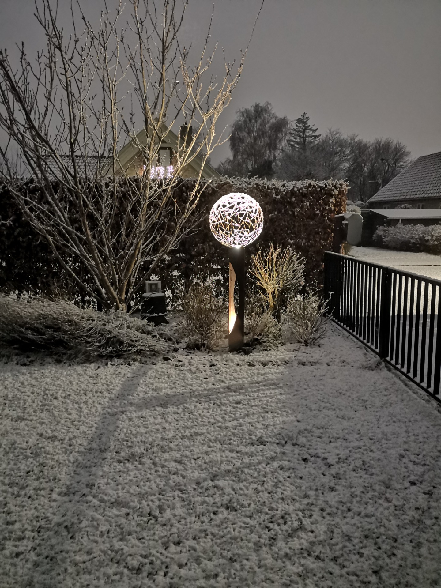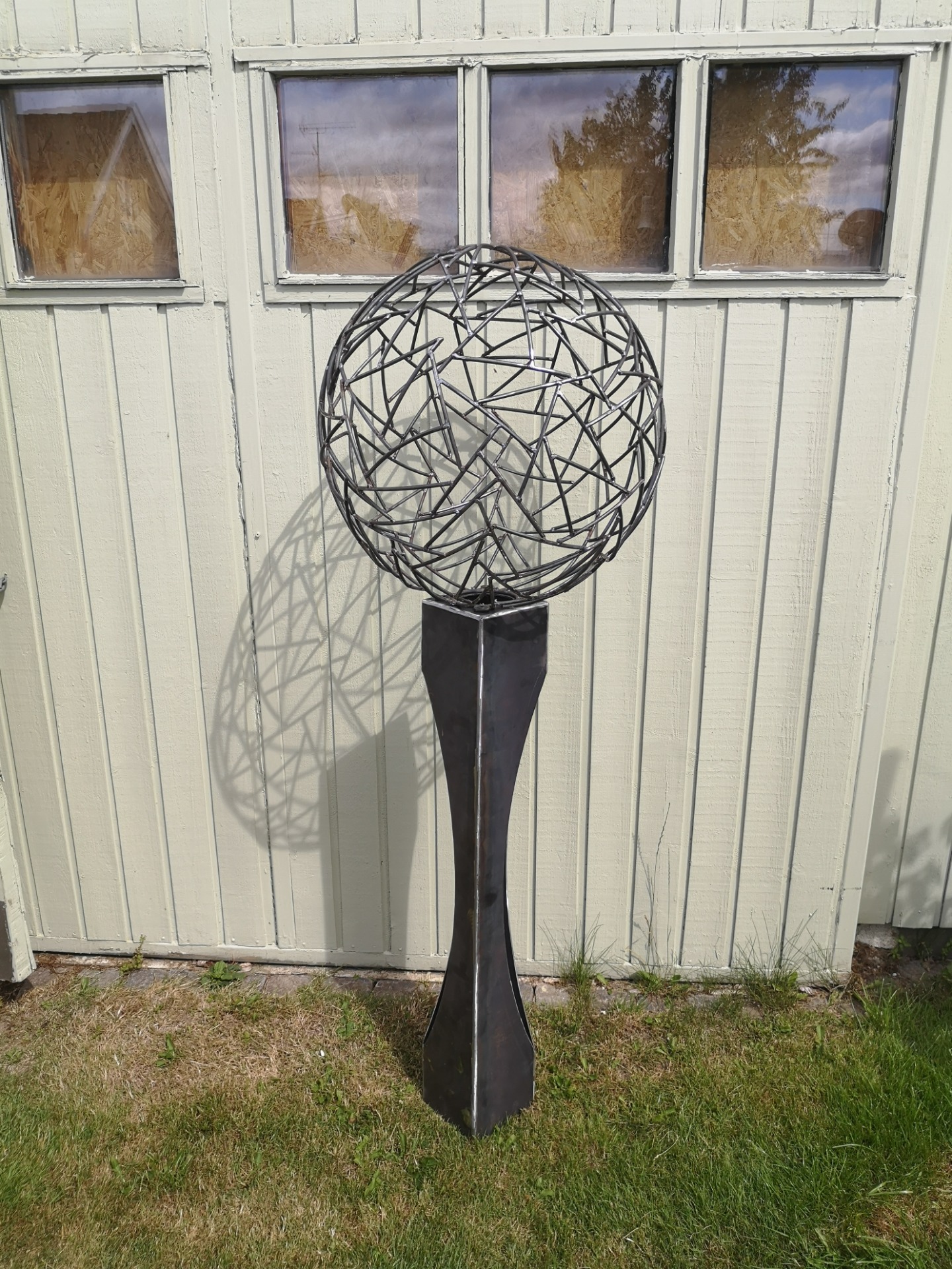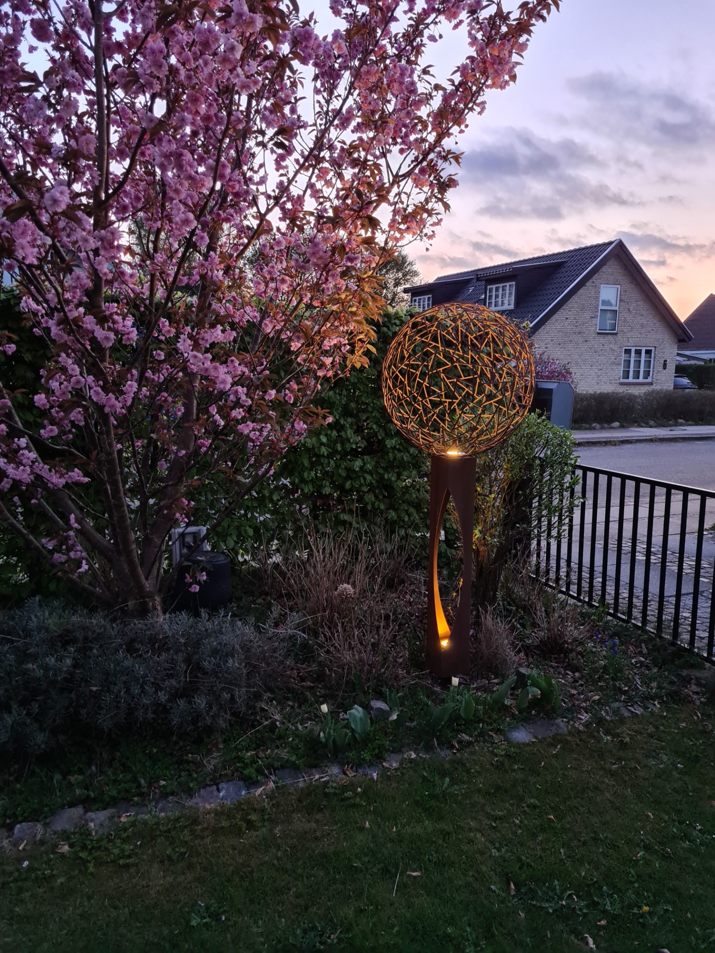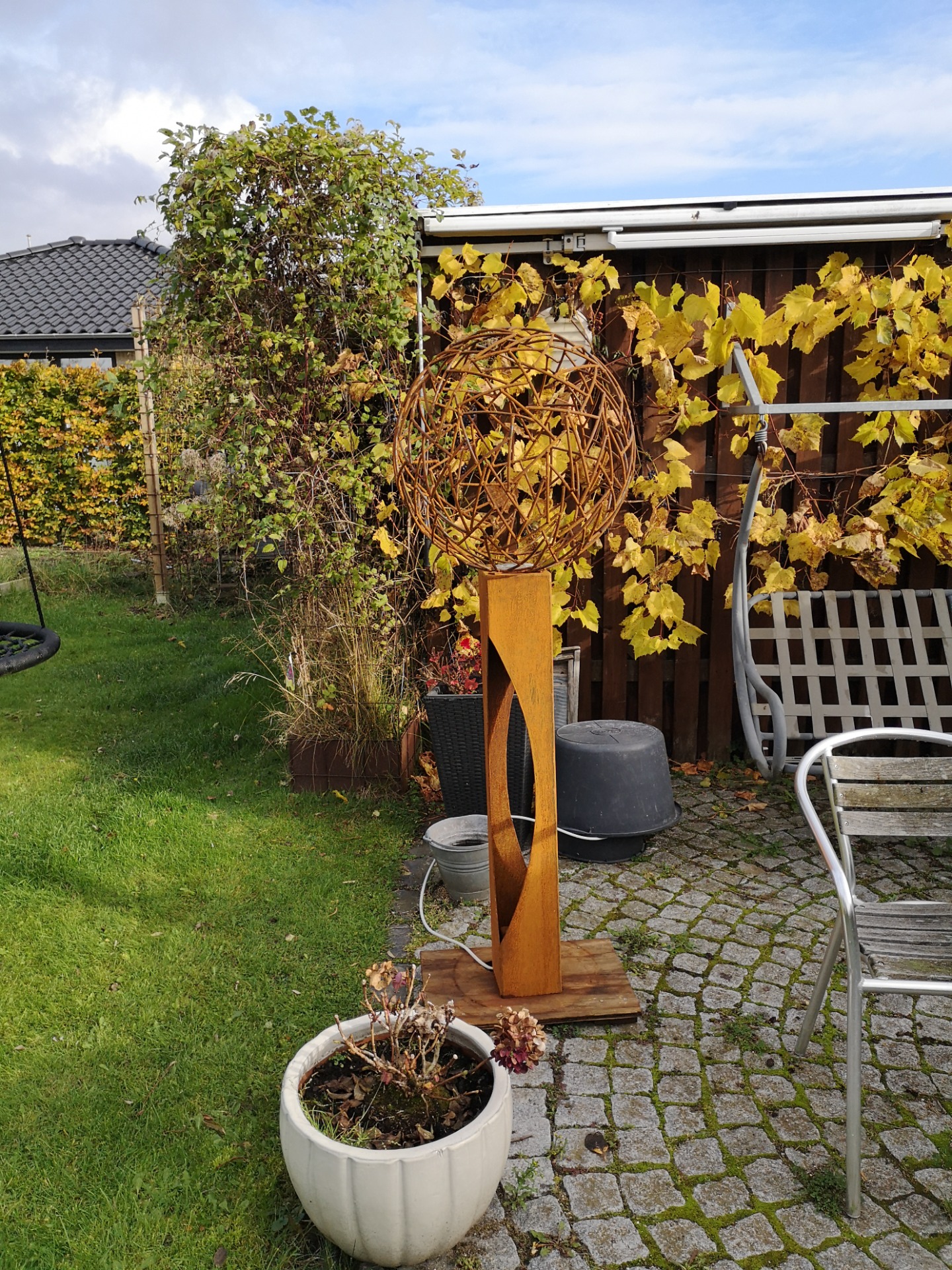 Kaos kuglen (ø70cm) på søjle udført i jern, som har fået en rusten overflade af vejret. Der er indbygget en led spot (IP66) i toppen af søjlen, som giver kuglen liv når det er mørkt. Er lavet til at stille udendørs, monteres i jorden ved hjælp af det påskruet fundament af stål.